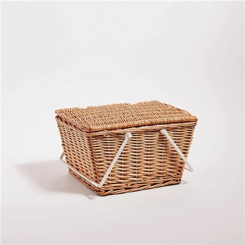 Enjoy the blissfulness of a picnic with this Small Picnic Basket. It features a classic wicker exterior, with a cotton interior for a sophisticated design. The basket also includes two sets of stainless-steel cutlery with wooden handles; two reusable cups; two reusable plates; and one bottle opener – everything you need for the perfect picnic.